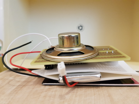 The battery is connected to GROUND and VBAT with the VBAT lead connected to the On-Off switch which is located in the left leg. This acts as the main power switch which really turns off the whole thing except when being powered by the Qi charger. I had to put the switch in-between instead of connecting it to the ENABLE pin because the Music feather would still draw power from the Battery and Qi/USB even when the 3.3V regulator was turned off. With that I had two problems; the FeatherWing and Speaker would stay on which would produce a bit of noise and exhaust the battery faster, but really the biggest problem was that I would get sd-card errors when it turned back on.